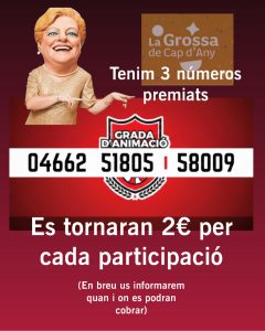 Es tornaran 2€ per participació 31 de desembre de 2025 Hola a tothom En el sorteig efectuat avui de La Grossa de Cap d’Any han estat agraciats dels 3 números que teniem a la nostra participació. Es tornaran 2€ per cada participació. En els propers dies s’informarà de quan i on es podran cobrar. Molt bon any 2026! Post navigation Previous Previous post: Una entrada d’any plena de CONGOST Deixa un comentari Cancel·la les respostesL'adreça electrònica no es publicarà. Els camps necessaris estan marcats amb *Comentari * Nom * Correu electrònic * Lloc web Desa el meu nom, correu electrònic i lloc web en aquest navegador per a la pròxima vegada que comenti. The reCAPTCHA verification period has expired. Please reload the page. Δ Entrades anteriors Una entrada d’any plena de CONGOST 31 de desembre de 2025 0 Comunicat Oficial de la Grada d’Animació 14 d'octubre de 2025 0